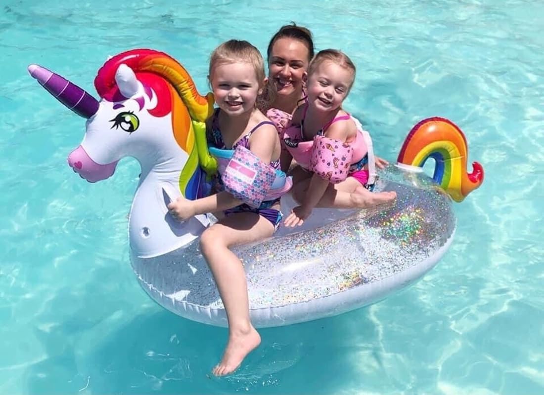 - Add some joy and fun to your pool party. This sparkling unicorn float will brighten pool and beach activities with plenty of smiles. Great swim toy to ride for kids on a hot summer day.